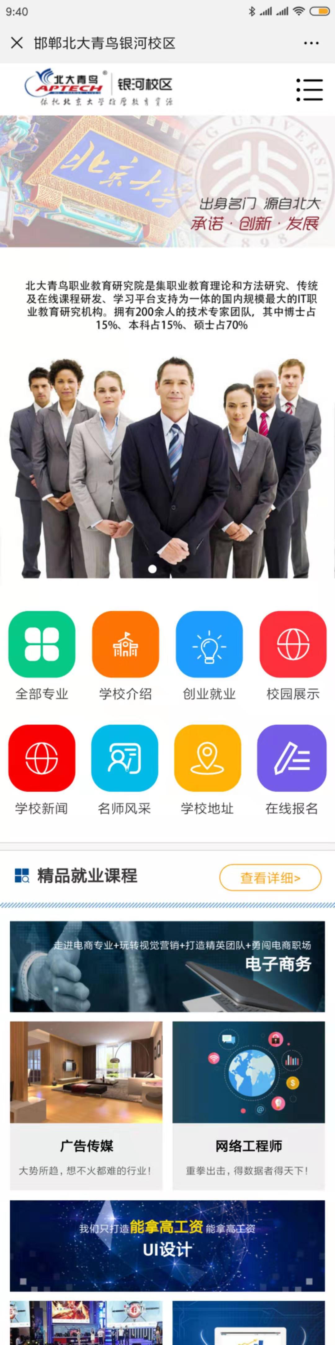 新聞?wù)?邯鄲冀南新區(qū)銀河中等專業(yè)學(xué)校,是北大青鳥(niǎo)總部在邯鄲地區(qū)唯一授權(quán)培訓(xùn)中心:北大青鳥(niǎo)(邯鄲)銀河校區(qū)。學(xué)校位于邯鄲冀南新區(qū)緊鄰邯鄲機(jī)場(chǎng),學(xué)校開(kāi)設(shè)了啟蒙星、軟件工程、Ui 設(shè)計(jì)、網(wǎng)絡(luò)工程師、游戲動(dòng)漫、廣告?zhèn)髅?、電子商?wù),是邯鄲地區(qū)規(guī)模較大的IT學(xué)校。